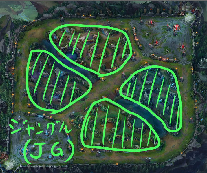 様々なモンスターが一定時間ごとに湧き、ジャングラーは、ここにいるモンスターを狩って経験値やお金を稼ぐ。