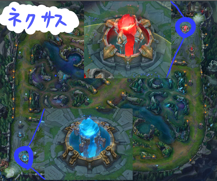これを、最低で5本壊さないとネクサスに攻撃ができない。(詳しくは上記「レーン」をご確認ください)