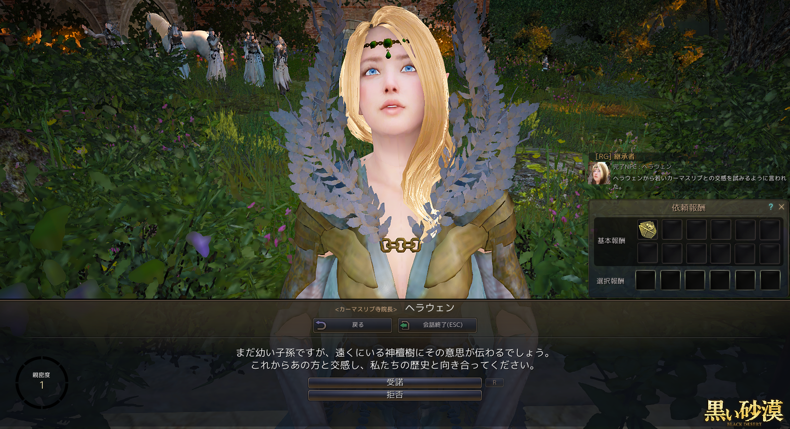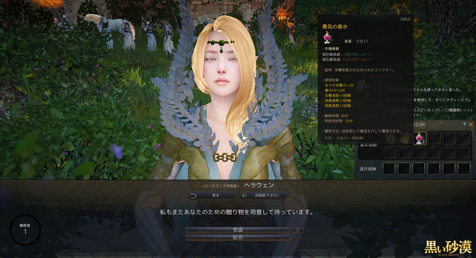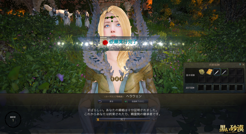 覚醒クエスト毎回恒例、3つのクエストを受けられます。報酬は精霊剣(レンジャーの覚醒武器)を2種類。それからスキル経験値と、スキルの秘伝書的な何か。