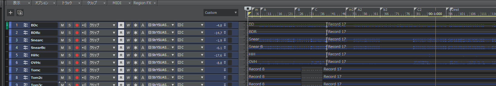 これで何テイクか録って、パンチやらコンピングやらしてできたドラムトラックがこちら↓