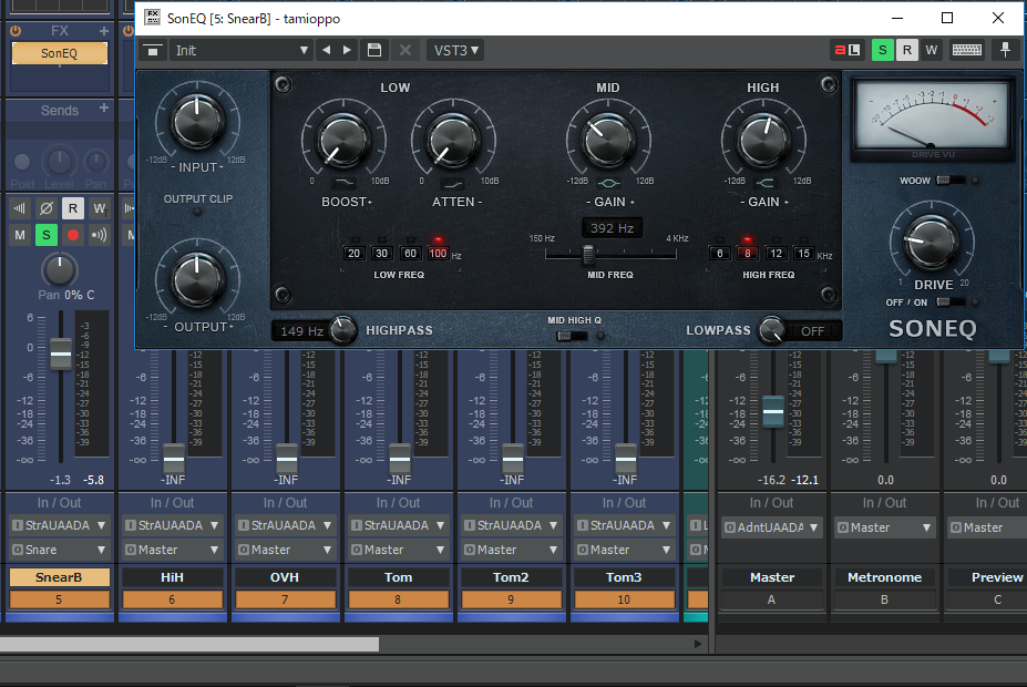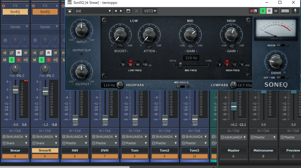 ↑バスのFX欄に、EQを挿す。今回使うのはSonEQというフリーのEQ。