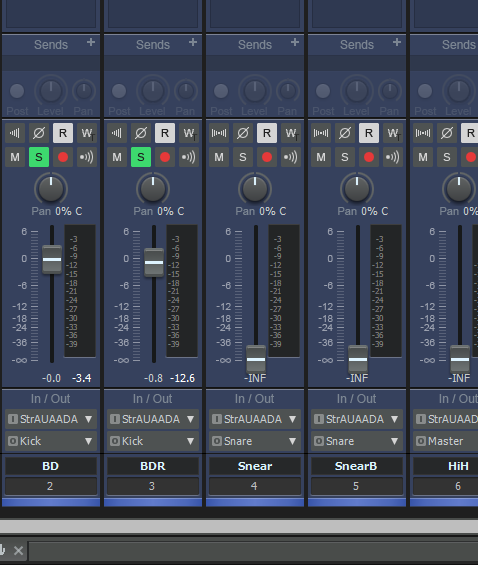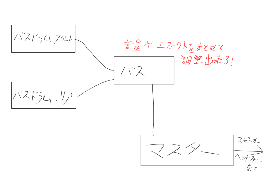 今回使っている、DrumMic’aという音源の場合、バスドラムがリアとフロントヘッドで2つ録っているので、それのバランスを固定するためにバスを作ります。