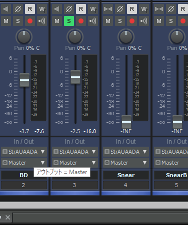 そしたら、バスドラム2つのアウトプットをこのバスに設定します。