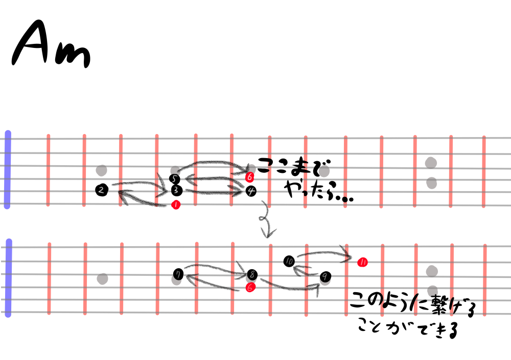 さらに、ハイフレットまで移動できるので、なんとなく「かっこよく弾けてる感」が出ますし、ルートを変更するだけでキーを変えられるという感覚も身につく。