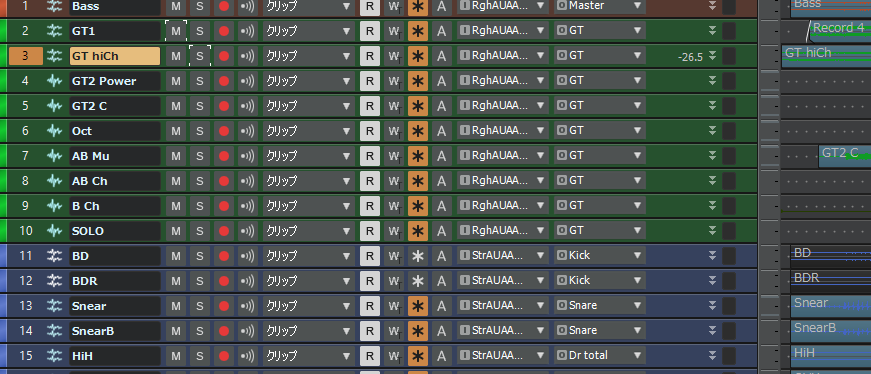 ハードのエフェクターを持っている方は、そちらで切り替えながら録音できるので、ここまでトラックは増やさなくてもいいです。